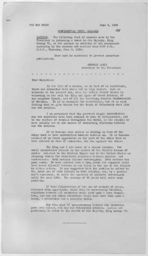 | Keywords: Remarks of the President in proposing a toast to King George the Sixth of England - NARA - 197868.jpg Scope and content General notes 197868 Local identifier President 1933-1945 Roosevelt 1933 - 1945 NARA-Author Roosevelt Franklin D Franklin Delano 1882-1945 Author 1301590 <br /> England United Kingdom Europe country 4181998 53 -2 <br /> Franklin D Roosevelt Library NLFDR 4079 Albany Post Road Hyde Park NY 12538-1999 1939-06-08 Record group Collection FDR-PPF Papers as President President's Personal File 1933 - 1945 Record group ARC 1185 Speeches of President Franklin D Roosevelt compiled 1933 - 1945 Series ARC 197300 File unit First Carbon Files 1933 - 1945 File unit ARC 197301 Variant control numbers NAIL Control Number NLR-PPF-1820-1STCARBON-SF20 Other versions <gallery> File Remarks_of_the_President_in_proposing_a_toast_to_King_George_the_Sixth_of_England_-_NARA_-_197868 tif tif File Remarks_of_the_President_in_proposing_a_toast_to_King_George_the_Sixth_of_England_-_NARA_-_197868 jpg jpg </gallery> NARA-cooperation PD-USGov Documents related to Franklin Delano Roosevelt |