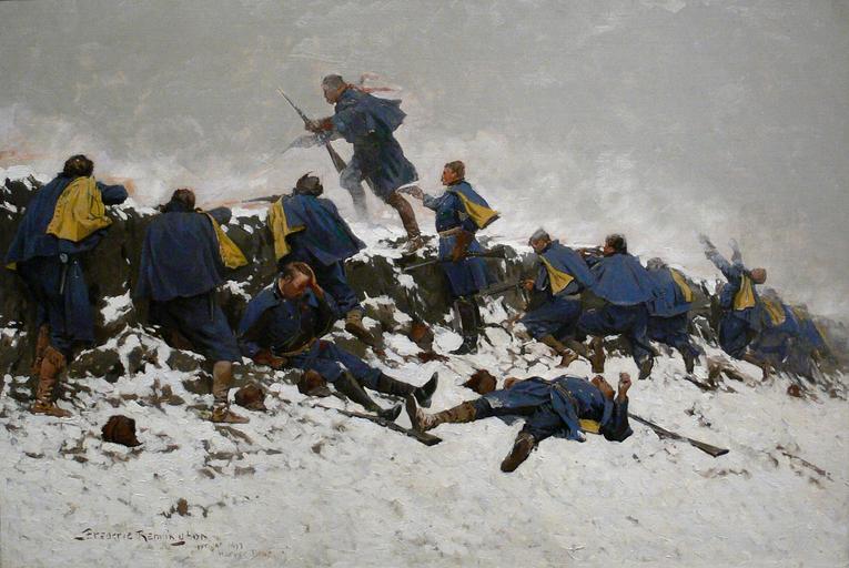 Keywords: Remington Through the Smoke Sprang the Daring Soldier 1897.jpg Through the Smoke Sprang the Daring Soldier oil on canvas Amon Carter Museum 1961 243 depicting a fight between US soldiers and a band of Northern Cheyenne in Northwestern Nebraska in January 1890 own photo User FA2010 2009 10 1897 Creator Frederic Remington The painting is in the Public Domain due to age The photograph has been dedicated to the Public Domain by the photographer Works by Frederic Remington in the Amon Carter Museum Paintings in the Amon Carter Museum 1897 paintings Paintings of battles Snow in art 1890 events |