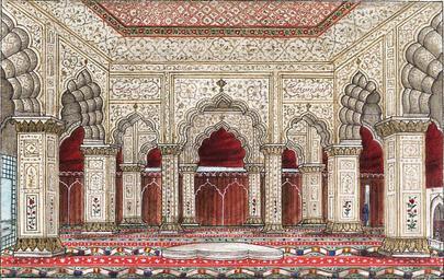 Keywords: Reminiscences of Imperial Delhi The interior of the Diwan-i Khass.png The Dewan-e-Khafs or Audience Hall for the Nobility was constructed by the Emperor Shah Juhan by whom the Royal Palace was also built It is situated at the upper end of a spacious Square elevated upon a Terrace of white Marble about four Feet in height The Dewan-e-Khafs in former times was adorned with Excessive Magnificence and though plundered by Nadir Shah the King of Persia during his invasion in 1738/9 and subsequently mutilated by the Barbarous Hordes of Mahrattas during the later end of the past and beginning of the present Century still retains sufficient Beauty to render it the object of Admiration The dimensions are said to be 150 feet in length by 40 in breadth The roof is flat supported by numerous Columns of white Marble richly ornamented with inlaid flower Work of different coloured Stones chiefly Cornelian The Cornices and Borders being decorated with Frieze and Sculptured work The Cieling sic was formerly incrusted with a rich Foliage of Gold and Silver Work throughout its whole Extent This during the Period of Anarchy was removed and an imitation Ceiling which still exists substituted In the interior of the Building and in the Cornice are the following lines written in the Persian Character in letters of Gold In Persian agar firdaus bar rui zamin ast hamin ast va hamin ast va hamin ast Ugur Firdoce bur Rooe Zumeen ust Humeen usto Humeen usto Humeen ust If there be a Paradise upon Earth It is this It is this It is this The Diwan-i Khass from the west with canopies and screens The Red Fort was commissioned by Shah Jahan r 1627-58 in 1639 it took nine years to build and was the seat of the Mughal power until 1857 when Bahadur Shah Zafar the last Mughal emperor was dethroned and exiled Part of the palace complex the Diwan-i-Khas or Hall of Private Audience was where the emperor would consult with his advisors and meet important visitors The hall was built entirely of white marble inlaid with precious stones The hall ™s ceiling was once silver which was removed by the Marathas and the spectacular Peacock throne was taken by Nadir Shah of Persia in 1739 Inscribed naqsha-i divan-i khass andarun-i qil ˜a-i shahjahanabad Mazhar ˜Ali Khan The interior of the Diwan-i Khass with qanats concealing the Khwabgah and the Scales of Justice Inscribed naqsha-i andarun-i divan-i khass dar qil ˜a-i shahjahanabad taraf-i shamal hast ˜amal-i Mazhar ˜Ali Khan From 'Reminiscences of Imperial Delhi ™ an album consisting of 89 folios containing approximately 130 paintings of views of the Mughal and pre-Mughal monuments of Delhi as well as other contemporary material with an accompanying manuscript text written by Sir Thomas Theophilus Metcalfe 1795-1853 the Governor-General ™s Agent at the imperial court Acquired with the assistance of the Heritage Lottery Fund and of the National Art-Collections Fund http //www bl uk/onlinegallery/onlineex/apac/addorimss/t/019addor0005475u00021vrb html 1843 creator Thomas Theophilus Metcalfe 100px Same view without shamiana covers PD-old-100 Diwan-i-Khas Red Fort Red Fort in art Reminiscences of Imperial Delhi Thomas Theophilus Metcalfe |