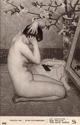 Keywords: René Schützenberger - La Coiffure CP.jpg Artwork en The Head Dress exhibited at the Salon de de la Société Nationale des Beaux-Arts of 1911 signed on the bottom of the mirror fr La Coiffure exposée au Salon de de la Société Nationale des Beaux-Arts de 1911 signée en bas dans le miroir 1911 Oil on canvas 121 X 91 cm accession number object history credit line Carte postale Salons de Paris ; scan by 9jules9 Image René Schützenberger - Nu à sa coiffure jpg PD-old René Schützenberger Paintings of nude kneeling females Schutzenberger Mirrors in paintings Oil paintings of women 1911 paintings Nude kneeling women in art |