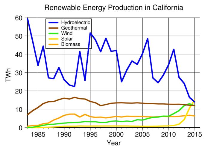Keywords: Renewable energy production in California.svg en Renewable energy electricity production in California from 1983 to 2015 Data from http //energyalmanac ca gov/electricity/ California Energy Commission 2016-03-30 own Delphi234 other versions Generated with Wikimedia SVG Chart SVG Chart/box cc-zero Renewable energy in the United States Geothermal energy in California Hydroelectric power in the United States Solar power in California Wind power in California |