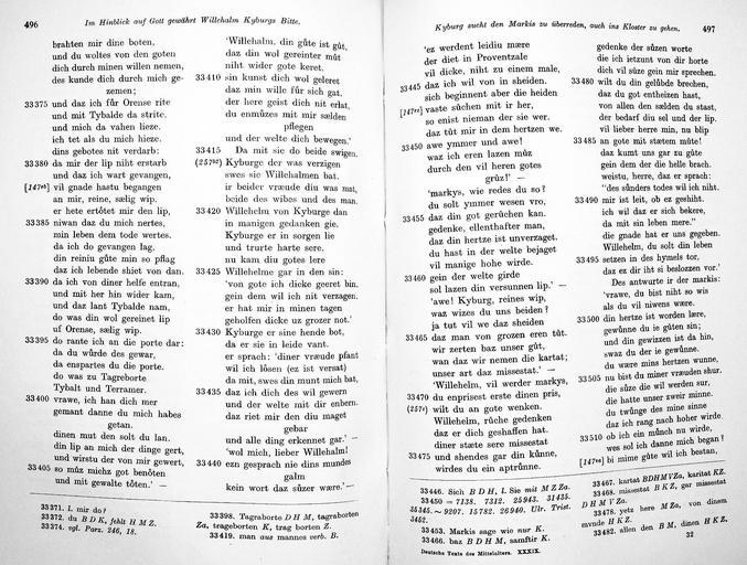 | Keywords: Rennewart Seite 496 497.jpg  Alfred Hübner Hg Ulrich von Türheim Rennewart Aus der Berliner und Heidelberger Handschrift Deutsche Texte des Mittelalters 39 Berlin 1938 S 496f Scan vom Original 13 Jahrhundert Text Ausgabe 1938 Ulrich von Türheim Ulrich von Türheim PD-old |