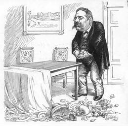 Keywords: Rent bord.jpg sv 1895 hade statsminister Boström tillsatt ett hemligt riksdagsutskott för att hantera unionsfrågan 1905 föreslog han samma åtgärd vilken också genomfördes Överläggningarna i detta utskott havererar dock Kronprinsens fredliga linje mötte motstånd från både regerings- och riksdagshåll Det ledde bland annat till att statsminister Boström avgick och en ny regering under statsminister Ramstedt tillträdde Trots detta lyckades man ändå inte nå enighet i utskottet Det illustreras av denna bild med justitieministern Berger som källarmästare Rent bord med källarmästare Berger justitieministern Han betraktar ruinerna dagen efter och utbrister Oj oj min dyrbara servis Visserligen var det bara utskottsporslin Men var ska jag nu få tag i något folk som tar upp den Puck 11 maj 1905; http //www pressehistorisk no/index asp id 98787 Norsk pressehistorisk forening Edvard Forsström 1905 PD-Art 1905 cartoons Edvard Forsström Ossian Berger Union between Sweden and Norway |