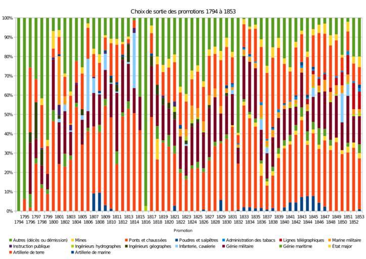 Keywords: Répartition Corps Polytechnique 1794-1853.svg fr Évolution des choix des polytechniciens pour les différents Corps de l'État entre 1794 et 1853 Source C P Marielle Répertoire de l'École impériale polytechnique ou Renseignements sur les élèves qui ont fait partie de l'institution depuis l'époque de sa création en 1794 jusqu'en 1853 inclusivement avec plusieurs tableaux et résumés statistiques suivi de la liste des élèves admis en 1854 et de l'indication des mutations survenues dans l'intérieur de l'école jusqu'au 25 septembre 1855 Mallet-Bachelier 1855 289 p p 328 Les données ne tiennent pas comptent des éventuelles démissions dans chaque Corps ou d'un changement de Corps 2013-03-26 20 47 45 own A455bcd9 cc-zero Uploaded with UploadWizard École polytechnique |