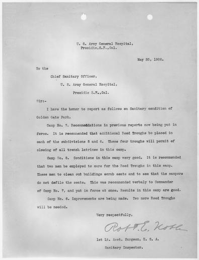 | Keywords: Report of the 1st Lieutenant, Assistant Surgeon USA, Robert E. Noble, Sanitary Inspector, sent from US Army General... - NARA - 296632.tif Scope and content This document pertains to the federal response to the 1906 San Francisco Earthquake and Fire General notes 296632 Local identifier War Department Letterman General Hospital ca 1898 - 09/18/1947 NARA's Pacific Region San Bruno NRHAS 1000 Commodore Drive San Bruno CA 94066-2350 1906-05-20 Record group Record Group 112 Records of the Office of the Surgeon General Army 1775 - 1994 Record group ARC 441 Correspondence and Related Records Pertaining to the San Francisco Earthquake and Fire of 1906 compiled 1906 - 1906 Series ARC 296611 File unit Inspection Reports General Inspections Reports of Special Inspections File unit ARC 296612 Variant control numbers NAIL Control Number NRHS-112-LETGHCORSFEQF1906-INSPGEN-20 yes Other versions NARA-cooperation PD-USGov San Francisco earthquake of 1906 |