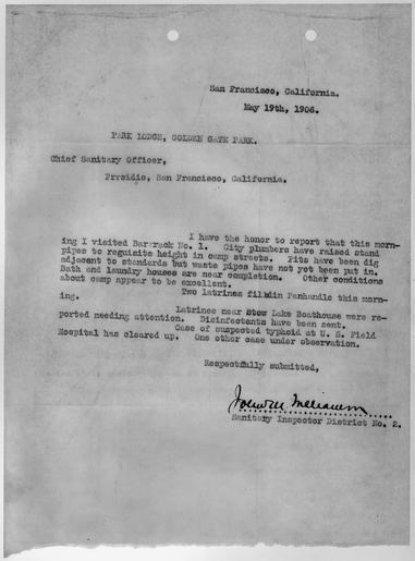 | Keywords: Report of the Sanitary Inspector, District No. 2, sent from Park Lodge, Golden Gate Park, San Francisco to Chief... - NARA - 296629.tif Scope and content This document pertains to the federal response to the 1906 San Francisco Earthquake and Fire General notes 296629 Local identifier War Department Letterman General Hospital ca 1898 - 09/18/1947 NARA's Pacific Region San Bruno NRHAS 1000 Commodore Drive San Bruno CA 94066-2350 1906-05-19 Record group Record Group 112 Records of the Office of the Surgeon General Army 1775 - 1994 Record group ARC 441 Correspondence and Related Records Pertaining to the San Francisco Earthquake and Fire of 1906 compiled 1906 - 1906 Series ARC 296611 File unit Inspection Reports General Inspections Reports of Special Inspections File unit ARC 296612 Variant control numbers NAIL Control Number NRHS-112-LETGHCORSFEQF1906-INSPGEN-17 yes Other versions NARA-cooperation PD-USGov San Francisco earthquake of 1906 |