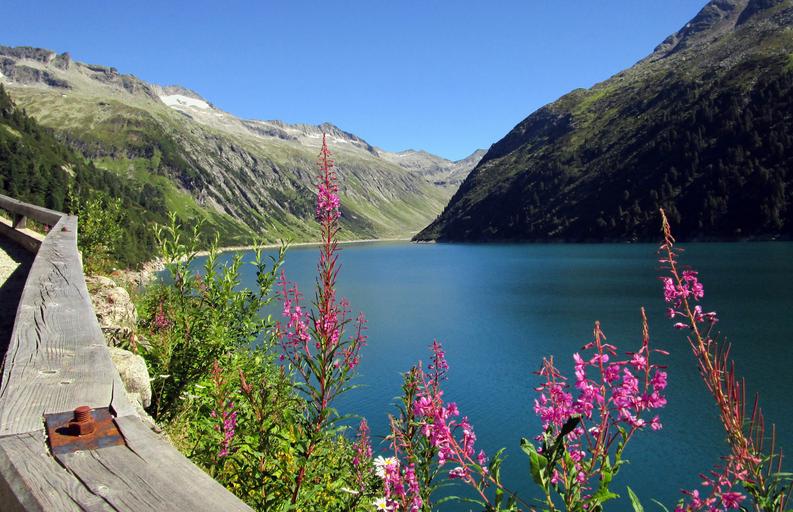 Keywords: reservoir water storage lake water reservoir water alpine nature mountains austria panorama hiking sky clouds landscape plant wild flower highlands distant view partly cloudy blue sky holiday ziller basic zillertal water power cycling mount bike