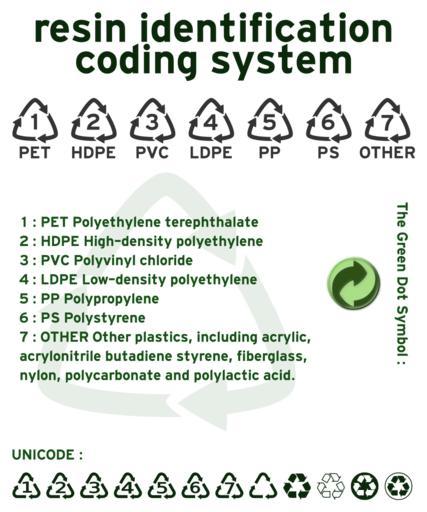Keywords: Resin identification code.svg The SPI resin identification coding system is a set of symbols placed on plastics to identify the polymer type Bonus Unicode Green Dot Symbol Tags SPI resin identification coding system Unicode recycle green dot symbol green pp ps pvc hdpe ldpe pet polymer recycling polyethylene useful Viewed by 2337 People Favorited by 0 People SVG filesize 420840 bytes 2013-02-09 16 39 22 Open Clipart Library http //openclipart org/detail/84931/resin-identification-code-by-filtre Filtre Custom license marker 2013 02 09 http //openclipart org/detail/84931/resin-identification-code-by-filtre Uploaded with UploadWizard Resin identification codes |