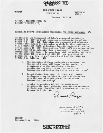 | Keywords: Restoring Normal Immigration Procedures for Cuban Nationals - NARA - 198391.tif Scope and content General notes 198391 Local identifier President 1981-1989 Reagan National Security Council 1981 - 1989 Ronald Reagan Library NLRR 40 Presidential Drive Simi Valley CA 93065-0600 1988-01-26 Record group Collection RR-NSC Numbered National Security Policy Papers 1981 - 1989 Record group ARC 1189 National Security Decision Directives compiled 02/25/1981 - 01/19/1989 Series ARC 198166 File unit File unit ARC Variant control numbers NAIL Control Number NLS-NSC-NSDD-299 yes Other versions <gallery> File Restoring_Normal_Immigration_Procedures_for_Cuban_Nationals_-_NARA_-_198391 tif tif File Restoring_Normal_Immigration_Procedures_for_Cuban_Nationals_-_NARA_-_198391 jpg jpg </gallery> NARA-cooperation PD-USGov Presidential Decision Directives Reagan NARA TIF images with categorized JPGs |