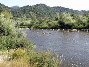 Keywords: Retournac Côtes de Saint-Ignac.JPG Retournac dép de la Haute-Loire France Auvergne La Loire au nord-est de Retournac en amont du pont ferroviaire près du hameau de Chambonnet Les hauteurs boisées et rocheuses au second plan sont les côtes de Saint-Ignac La Loire qui coule ici de droite à gauche fait ensuite un virage à droite et passe au pied des côtes de Saint-Ignac Le sommet dans le lointain à gauche est la montagne de la Madeleine Nous regardons vers le nord-est own Photo personnelle Torsade de Pointes Août 2009 Retournac Loire River in Haute-Loire |