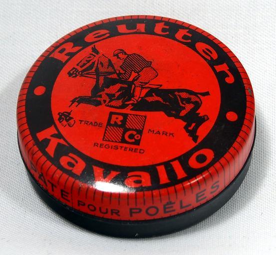 Keywords: Reutter Kavallo Horse Shoe Polish Tin 1930s picture 3.JPG Very old packaging of a Dutch product that is not produced and not sold any more Photographed at a collector of Droste For info see http //www tincollectors nl/ tincollectors nl or email info tincollectors nl own 2014-06-15 11 28 44 Alf van Beem CC-Zero Trademarked Shoe polish tins |