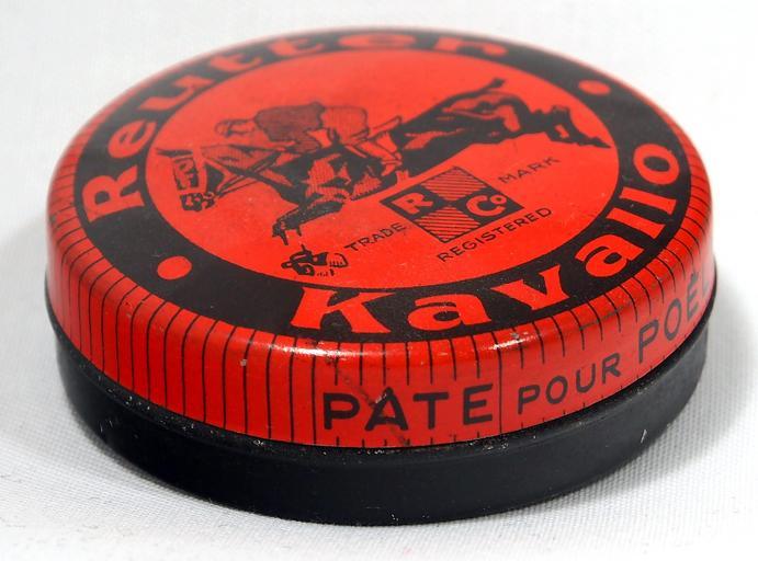 Keywords: Reutter Kavallo Horse Shoe Polish Tin 1930s picture 5.JPG Very old packaging of a Dutch product that is not produced and not sold any more Photographed at a collector of Droste For info see http //www tincollectors nl/ tincollectors nl or email info tincollectors nl own 2014-06-15 11 30 24 Alf van Beem CC-Zero Trademarked Shoe polish tins |