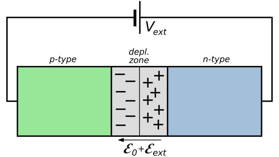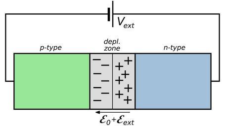 Keywords: Reverse-Biased pn Junction.svg Diagram of a pn junction under forward bias the resultant electric field <math>\mathcal E _0+\mathcal E _ ext </math> the depletion zone the space charges and the types of semiconductor Own drawing done in Inkscape 2007-02-20 inductiveload Reverse Biased pn Junction PN-junction diagrams |