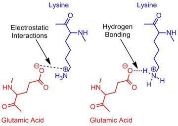 Keywords: Revisited Glutamic Acid Lysine salt bridge.png en salt bridge own Chem540f09grp6 Hydrogen bonding Lysine Glutamic acid