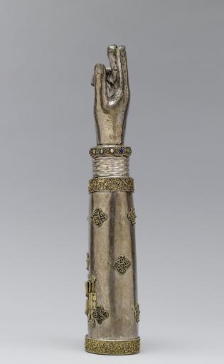 | Keywords: Rhenish - Arm Reliquary of Saint Pantaleon - Walters 57688 - Left Side.jpg This silver arm is known as a speaking reliquary because it takes shape of the body part it once contained The reliquary reputedly held an arm bone of Saint Pantaleon a Holy Doctor martyred in Asia Minor AD 305 who later became the patron saint of physicians The remains of an inscription along the seam of the sleeve refer to the saint by name The small door with the two glass shields was added in the 15th century as was the crystal at the edge of the sleeve Reliquary late 13th century; Additions 15th century Medieval gilded silver with rock crystal semiprecious stones glass and niello cm 47 2 12 8 9 2 accession number 57 688 25190 A Tollin Paris Chevallier Mannheim Paris May 20 1897 no 79 Robert Hoe New York American Art Association New York February 15 1911 no 1813 Wareham Harding New York Henry Walters city Baltimore Walters Art Museum Henry Walters Acquired by Henry Walters 1920 Transcription Incomplete inscription in niello on the narrow silver strip ornamenting the seam of the sleeve DE SANCTI PANTALEONIS + AVE; Translation From Pantaleon greetings A Medieval Treasury from Southern Collections Ackland Art Center University of North Carolina at Chapel Hill Chapel Hill 1961 Reliquaries and Ritual Medieval Objects of Devotion The Walters Art Gallery Baltimore 1984-1985 Treasures of Heaven The Cleveland Museum of Art Cleveland; The Walters Art Museum Baltimore; The British Museum London 2010-2011 place of origin west Germany Walters Art Museum license Arm Reliquary of Saint Pantaleon |