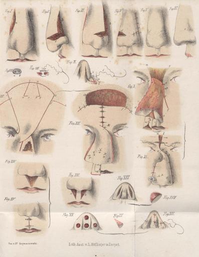 Keywords: Rhinoplasticen.JPG en Plate drawn by Julius von Szymanowski on reconstructive rhinoplasty Szymanowski Adnotationes ad rhinoplasticen typ viduæ J C Schünmanni et C Mattieseni Dorpati Liv 1857 Julius von Szymanowski died 1868 1857 PD due to its age PD-old Julius von Szymanowski |