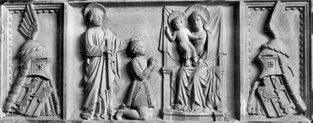 Keywords: Riccardo Gattola - Relief from the Tomb of Riccardo Gattola - Walters 27315.jpg Here the deceased Riccardo Gattola kneels in his armor before the Virgin and Child from whom he receives a blessing His hope for salvation is represented by this depiction of his devotion to the Virgin while alive He is presented by a pilgrim probably Saint James the Great venerated as a protector of knights and crusaders holding a staff partly missing and food bag Riccardo Gattola came from Gaeta south of Rome and was one of the courtiers of Queen Giovanna II of Naples This relief originally formed the front of Gattola's sarcophagus which was supported by four short columns On the lid was a reclining statue of him dressed in armor and an inscription with his name the date and the name of the artist Other elements of the tomb belong to the Museo Bardini Florence This complex tomb very likely once stood in a church in Gaeta The three-panel format severe facial expressions stylized drapery and draped throne recall other works by Paolo da Gualdo Cattaneo who was influenced by Lombard sculpture of the late 14th century 1417 Late Medieval marble cm 75 190 12 7 accession number 27 315 33677 Stefano Bardini Florence by purchase Arthur Sambon Paris prior to 1928 by purchase Henry Walters city Baltimore Walters Art Museum Henry Walters Acquired by Henry Walters 1930 place of origin Gaeta Italy Walters Art Museum license Medieval art in the Walters Art Museum Media contributed by the Walters Art Museum needs category review Madonna and Child Media contributed by the Walters Art Museum needs artist review |