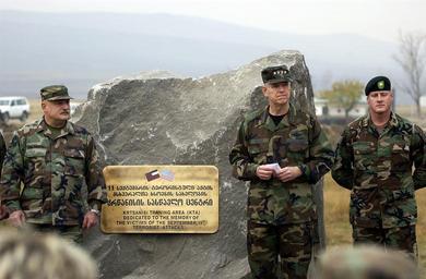Keywords: Richard B. Myers and David Tevzadze speak at a dedication dedication ceremony held to honor all of the victims of the September 11th terrorist attack (Krtsanisi, Georgia. Nov 25, 2002).jpeg NARA-image-full en Scene Caption US Air Force USAF General GEN Richard B Myers center Chairman of the Joint Chiefs of STAFF JCS and General Lieutenant David Tevzadze Republic of Georgia Minister of Defense speak at a dedication ceremony A memorial dedication ceremony held to honor all of the victims of the September 11th terrorist attack in New York and the Pentagon is conducted outside of the Advanced Operational Base for the Georgia Train and Equip Program in Krtsanisi Georgia General Myers is touring the Georgia Train and Equip Program GTEP complex and training grounds along with meeting top military officials and the Georgian President to discuss GTEP GTEP is a flexible time phased training initiative that builds upon a strong military-to-military relationship developed between the US and Georgia since the end of the Cold War and further underscores US support for the Republic of Georgia's sovereignty independence and territorial integrity Scope and content General notes Item from Record Group 330 Records of the Office of the Secretary of Defense 1921 - 2008 6274097 Local identifier 330-CFD-DF-SD-04-13070 jpeg http //arcweb archives gov/arc/action/ShowOrganizationsFullRecord 24searchId 5 24showFullAuthorityTabs selectedPaneId 24resultsPartitionPageModel targetModel true 24partitionIndex 0 24showAuthorityResultsTabs selectedPaneId 24resultsSummaryPageModel pageSize 10 24submitId 1 24resultsDetailPageModel search true 24resultsDetailPageModel currentPage 0 24resultsDetailPageModel pageSize 1 24resultsSummaryPageModel targetModel true 24resultsPartitionPageModel search true 24highlight false Department of Defense American Forces Information Service Defense Visual Information Center 1994 - Most Recent http //arcweb archives gov/arc/action/ShowOrganizationsFullRecord 24searchId 6 24showFullAuthorityTabs selectedPaneId 24resultsPartitionPageModel targetModel true 24partitionIndex 0 24showAuthorityResultsTabs selectedPaneId 24resultsSummaryPageModel pageSize 10 24submitId 1 24resultsDetailPageModel search true 24resultsDetailPageModel currentPage 0 24resultsDetailPageModel pageSize 1 24resultsSummaryPageModel targetModel true 24resultsPartitionPageModel search true 24highlight false Department of Defense Defense Audiovisual Agency 06/21/1979 - 09/30/1985 Predecessor http //arcweb archives gov/arc/action/ShowOrganizationsFullRecord 24searchId 7 24showFullAuthorityTabs selectedPaneId 24resultsPartitionPageModel targetModel true 24partitionIndex 0 24showAuthorityResultsTabs selectedPaneId 24resultsSummaryPageModel pageSize 10 24submitId 1 24resultsDetailPageModel search true 24resultsDetailPageModel currentPage 0 24resultsDetailPageModel pageSize 1 24resultsSummaryPageModel targetModel true 24resultsPartitionPageModel search true 24highlight false Department of Defense Department of the Navy Naval Imaging Command 1988 - ca 1993 Predecessor SSGT Justin D Pyle USAF Krtsanisi Still Picture Records Section Special Media Archives Services Division NWCS-S National Archives at College Park 8601 Adelphi Road College Park MD 20740-6001 2002-11-25 Record group Record Group 330 Records of the Office of the Secretary of Defense 1921 - 2008 Record group ARC 643 Combined Military Service Digital Photographic Files compiled 1982 - 2007 documenting the period ca 1786 - 2007 Series ARC 6274097 File unit File unit ARC Variant control numbers Agency-Assigned Identifier DFSD0413070 Other versions NARA-cooperation PD-USGov 2002 in Georgia David Tevzadze Krtsanisi National Training Centre Military of Georgia Georgia Train and Equip Program Mkhedruli plaques November 2002 photographs Battle Dress Uniform in 2002 Military people in 2002 |