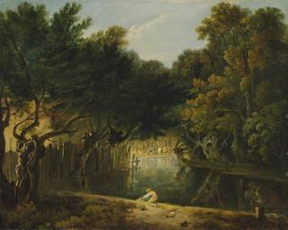 Keywords: richard wilson painting oil on canvas artistic nature outside sky clouds landscape forest fall autumn trees stream water boy