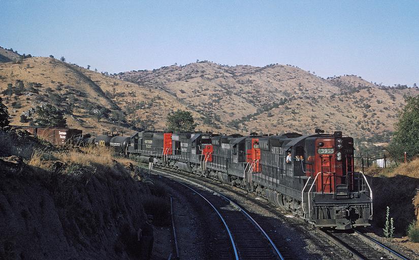 | Keywords: southern pacific southernpacific outdoor hill landscape mountainside About a year ago when I was posting some of Roger Puta's Santa Fe photographs, I put up some from his cab ride in AT&SF F7A 306L, the lead unit on Train 2, the San Francisco Chief. Well now that I'm scanning his Southern Pacific shots I came across photos from that cab ride taken on SP tracks. These three are Tehachapi Loop photos taken August 26, 1967, a year after Roger was a groomsman in my wedding. 2. SP SD9 3955 in the Tehachapi Loop siding. About a year ago when I was posting some of Roger Puta's Santa Fe photographs, I put up some from his cab ride in AT&SF F7A 306L, the lead unit on Train 2, the San Francisco Chief. Well now that I'm scanning his Southern Pacific shots I came across photos from that cab ride taken on SP tracks. These three are Tehachapi Loop photos taken August 26, 1967, a year after Roger was a groomsman in my wedding. 2. SP SD9 3955 in the Tehachapi Loop siding. |