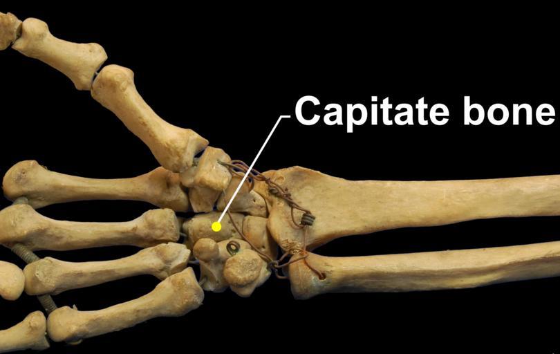 | Keywords: RightHumanAnteriorDistalRadiusUlnaCarpals - Capitate bone.png Bones of human right hand with thumb on top Anterior surface palmar surface Capitate bone labelled File RightHumanAnteriorDistalRadiusUlnaCarpals jpg 2013-11-16 Photo is by Brian C Goss No rights reserved -thumb left Original photo Capitate bone |