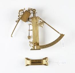 Keywords: Riktningsinstrument av förgylld mässing, 1648 - Skoklosters slott - 92856.tif LSH artwork Laurentius Mayer styckgjutare sv Bestående av en fot en graderad ståndare en sextant en pendel urspr två och en camera obscura periskop Sign Laurentius Mayer Stuckhaubtman fecit 1648 Foten är 103 mm bred och har en 21 mm hög triangulär urtagning på undersidan <br/>På fotens ovansida bakre delen är 45 mm lång skala 4 -0- 4 motsvarande den i sidled förskjutningsbara basen på ståndaren Ståndarna består av två delar Ram av två parallella ben förenade av tvärslåar upptill och nedtill Högra benet graderat nerifrån och upp 2-7 tum vänstra benet graderat 8-13 tum Mellan benen går en i höjdled skjutbar ograderad skena på ovansidan en tvärställd list På denna list två vertikala runda plattor mellan vilka placeras på liknande enkel platta på camera obscuran Plattan fästes samman med en skruv med blomholksliknande huvud och mutter Två dubbla plattor fastskruvade vid skenans nedre kant ger möjlighet till en alternativ placering av camera obscuran Sextanten är fastskruvad vid ståndarens högra ben Radie 143 mm Cirkelsektorn graderad från vänster till höger 5-45<br/> ojämna avstånd samt 5-50 jämna avstånd Vid sextantens centrum är fästat ett gjutet huvud från vilken hänger ståltråd till en före detta pendel Mellan sextantens radier är placerat ett kerubhuvud som främre stöd för pendeln En bevarad pendel 75 mm lång av ståltråd med ett gjutet janushuvud av mässing som lod Pendeln hänger genombruten volut upptill på ståndarens vänstra ben Nedtill på samma ben bildar en liknande volut en konsol till en platta med knopp för inställning av pendeln Camera obscura är en liten ask 45x33x27 mm med tak och botten av mörkt träslag och väggar av mässing Itaket och i högra väggen ett rektangulärt hål Inuti asken en snedställd spegel Under aske fastskruvat en 125 mm lång mässingspinne med uppåtböjd spets sikte Under pinnen genombrutna gjutna ornament med griphuvud och rullverk På askens vänstra sida fastskruvat ett beslag med ett gjutet lejon och en rund platta för fästande vid ståndaren original caption Rikningsinstrument av förgylld mässing 1648 <br/> Nyckelord Mätinstrument Vetenskap Vetenskapshistoria Föremålsbild Guld Mässing 1648 size mm 285 223 SKO Carl Gustaf Wrangel place of origin original filename sm_dig5516 28622 inventory number SKO 10616 92856 CC-BY-SA Fredrik Andersson <gallery caption Different images of same object > File Rikningsinstrument av förgylld mässing 1648 - Skoklosters slott - 92839 tif </gallery> Measuring instruments Brass Gold History of science Scientific instruments Fredrik Andersson Media contributed by LSH unmatched creator Media contributed by LSH 2014-11 |