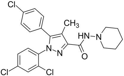 Keywords: Rimonabant 200.svg validSVG Structure of 5- 4-chlorophenyl -1- 2 4-dichlorophenyl -4-methyl-N- piperidin-1-yl -1H-pyrazole-3-carboxamide Own 2014-04-18 Emeldir <span class signature-talk >talk</span> Chemical structure verified https //upload wikimedia org/wikipedia/commons/1/19/Rimonabant_200 svg 1S/C22H21Cl3N4O/c1-14-20 22 30 27-28-11-3-2-4-12-28 26-29 19-10-9-17 24 13-18 19 25 21 14 15-5-7-16 23 8-6-15/h5-10 13H 2-4 11-12H2 1H3 H 27 30 JZCPYUJPEARBJL-UHFFFAOYSA-N 168273-06-1 Synonyms <small>5- 4-Chloro-phenyl -1- 2 4-dichloro-phenyl -4-methyl-1H-pyrazole-3-carboxylic acid piperidin-1-ylamide HCl 5- 4-Chlorophenyl -1- 2 4-dichlorophenyl -4-methyl-N- 1-piperidinyl -1H-pyrazole-3-carboxylic acid amide 5- p-Chlorophenyl -1- 2 4-dichlorophenyl -4-methyl-N-piperidinopyrazole-3-carboxamide Acomplia Rimocaban Rimonabant SR 141716 SR 141716A SR-141716 Zimulti</small> PD-chem Rimonabant |