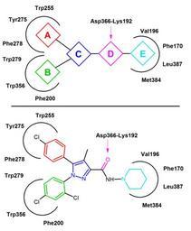 Keywords: Rimonabant Pharmacophore.png en A general CB1 receptor inverse agonist pharmacophore model Putative CB1 receptor amino acid side chain residues in receptor-ligand interaction are shown A and B both constitute an aromatic ring connected to a central core unit C A hydrogen bond acceptor unit D interconnects unit C with a lipophilic moiety E Rimonabant is taken as a representative example below The applied colors indicate the mutual properties with the general CB1 pharmacophore own Dagrun Saevarsdottir 2008-11-09 Receptors Pharmacophores Rimonabant |