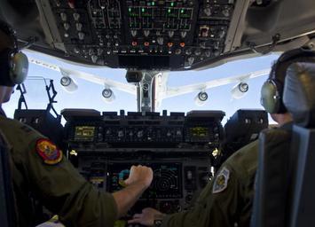 Keywords: RIMPAC 2012 120731-N-RI884-620.jpg en U S Air Force Capt Mike Reckert left and Maj Alan Partridge both pilots with the 535th Airlift Squadron maneuver their C-17 Globemaster III aircraft behind a KC-135 Stratotanker during a refueling mission over Hawaii July 31 2012 as part of Rim of the Pacific RIMPAC 2012 RIMPAC is a U S Pacific Command-hosted biennial multinational maritime exercise designed to foster and sustain international cooperation on the security on the world 2012-07-31 Petty Officer 2nd Class NPASEWest Hawaii https //www dvidshub net/image/639127 120731-N-RI884-620 2012-08-03 23 03 HI US PD-USGov-Military-Navy Boeing KC-135 Stratotanker Boeing C-17 Globemaster III Images from DoD uploaded by Fæ Aerial refueling as seen from the receiver |