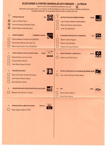 | Keywords: Rioja senado generales 2016.jpg es Papeleta electoral para el Senado - Elecciones Generales de España de 2016 circunscripción de La Rioja 2016-08-05 own B25es other versions cc-zero PD-SpanishGov <br/> De minimis The party logo Ballot papers for the 2016 general election for La Rioja Spain Ballot papers for the Senate in the 2016 Spanish General Elections Uploaded via Campaign bpsge | ||||