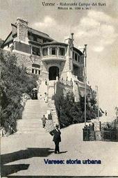 Keywords: Il Ristorante Campo dei Fiori (arch. Giuseppe Sommaruga, 1910) visto dalla stazione a monte della funicolare (la cui ombra si proietta a lato del conducente in uniforme). varese campodeifiori
