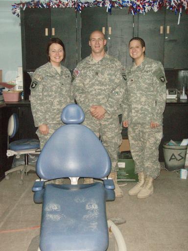 | Keywords: Riva Ridge TMC helps Soldiers battle tooth decay, provides lab work DVIDS111949.jpg en From left to right Sgt Tara Phillips a native of Nanih Waiya Miss ; Capt John Batson from Little Rock Ark ; and Spc Jessica Griffin from Mount Pleasant Texas work at the dental clinic at the Riva Ridge Troop Medical Clinic Aug 28 2008 The three all serve with Company C 526th Brigade Support Battalion 2nd Brigade Combat Team 101st Airborne Division Air Assault Multi-National Division “ Baghdad 2008-08-28 https //www dvidshub net/image/111949 111949 2008-08-31 08 34 BAGHDAD IQ PD-USGov 101st Airborne Division Images from DoD uploaded by Fæ |