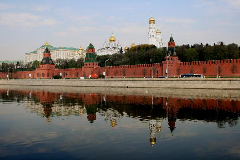 Keywords: river moscow russia water blue sky day time reflection kremlin wall kremlin towers terracotta brickwork white cathedrals domes cathedrals bell towers great kremlin palace