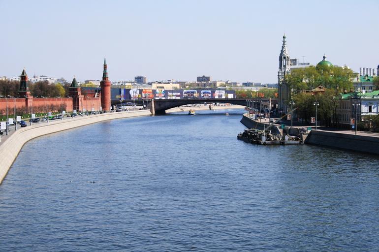 Keywords: river moscow russia water blue sky day time nature outdoors green trees green bushes spring city skyline bridge kremlin
