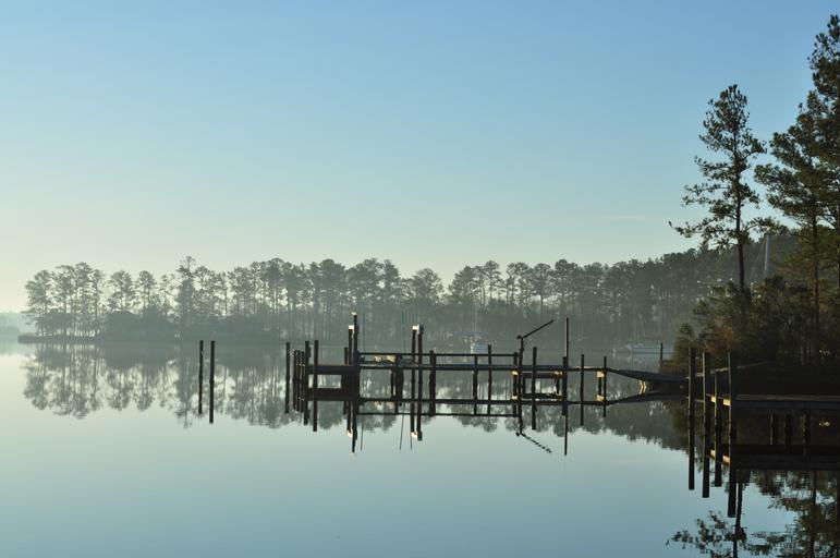 Keywords: river pier bridge dock harbor scenic water reflection sky idyllic waterfront trees forest woods horizon nature shore