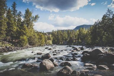 Keywords: river stream water rocks trees forest nature sky sunshine landscape