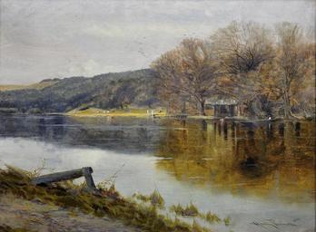 Keywords: River Thames, above Pangbourne Berkshire.jpg en River Thames above Pangbourne Berkshire Signed bas droite titled verso Oil on Canvas 54cm x 42cm before 1934 http //www bigskyfineart com/a/pennell-harry/river-thames-above-pangbourne-berkshire Harry Pennell Custom license marker 2013 02 05 PD-Art Uploaded with UploadWizard Harry Pennell River Thames at Pangbourne Paintings of the Thames Pangbourne Berkshire in art |