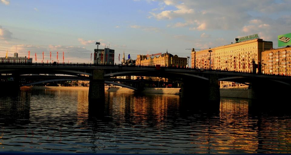 Keywords: river water bridge embankment buildings sun sunset reflections sky