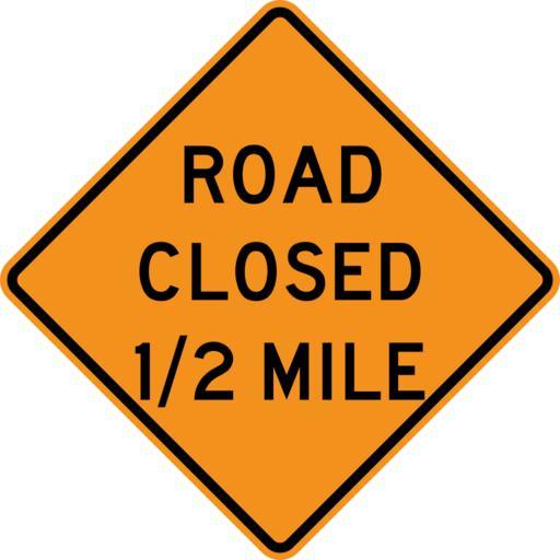 Keywords: Road Closed Half Mile sign.svg User Ltljltlj/Template 900 mm by 900 mm 36 in by 36 in Road Closed 1/2 Mile sign made to the specifications of the http //mutcd fhwa dot gov/SHSm/warning pdf 2004 edition of Standard Highway Signs sign W20-3 Uses the http //www triskele com/fonts/index html Roadgeek 2005 fonts United States law does not permit the copyrighting of typeface designs and the fonts are meant to be copies of a U S Government-produced work anyway Colors are from http //mutcd fhwa dot gov/kno-colorspec htm Pantone Orange 152 converted to RGB by http //www reeddesign co uk/test/pantone2rgb html W20-3 W20-3 - Road Street Closed with distance SVG road signs in the USA |