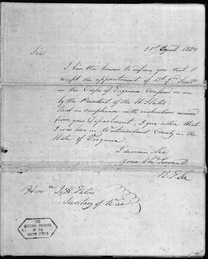 | Keywords: Robert E. Lee's Acceptance of the Appointment of Brevet 2nd Lieutenant in the Army Corps of Engineers - NARA - 300371.tif Scope and content Robert E Lee began his military career in the U S Army With this document Lee accepted his first military commission upon graduation from the U S Military Academy at West Point in 1829 General notes Exhibit History American Originals December 1995 - June 1996 National Archives Rotunda Washington DC Exhibit No 624 0019 300371 Local identifier War Department The Adjutant General's Office 03/04/1907 - 09/18/1947 Archives I Reference Section Textual Archives Services Division NWCT1R National Archives Building 7th and Pennsylvania Avenue NW Washington DC 20408 1829-08-21 Record group Record Group 94 Records of the Adjutant General's Office 1762 - 1984 Record group ARC 423 Letters Received compiled 1805 - 1889 Series ARC 300368 File unit File unit ARC Variant control numbers NAIL Control Number NWCTB-94-CORRPI17E12-L60 1829 <br /> NAIL Control Number NWDT1-94-CORR-PI17E12-L60 1829 yes Other versions <gallery> File Robert_E _Lee's_Acceptance_of_the_Appointment_of_Brevet_2nd_Lieutenant_in_the_Army_Corps_of_Engineers_-_NARA_-_300371 tif tif File Robert_E _Lee's_Acceptance_of_the_Appointment_of_Brevet_2nd_Lieutenant_in_the_Army_Corps_of_Engineers_-_NARA_-_300371 jpg jpg </gallery> NARA-cooperation PD-USGov 1829 letters Robert Edward Lee United States Army Corps of Engineers NARA TIF images with categorized JPGs |