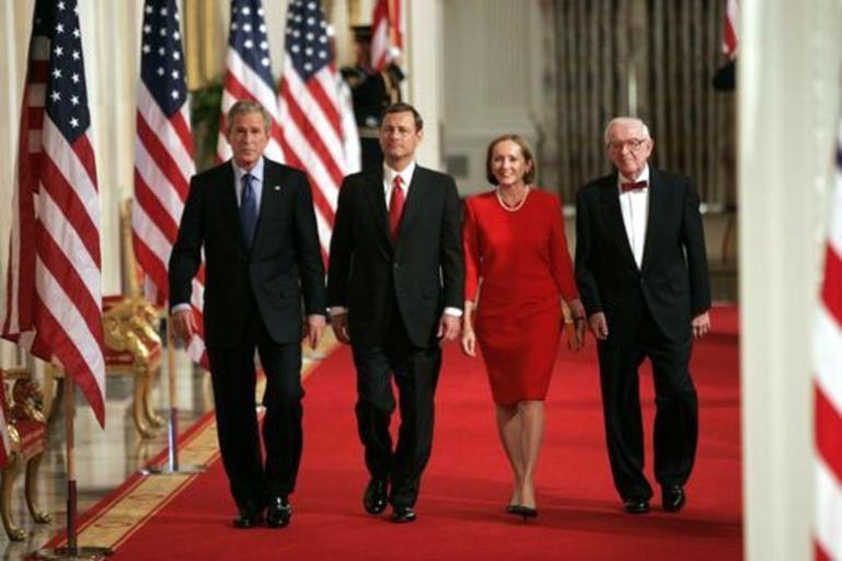 Keywords: Robertsoath2.jpg President George W Bush walks with Judge John Roberts his wife Jane Marie Sullivan Roberts and Associate Justice John Paul Stevens to the East Room of the White House Thursday Sept 29 2005 where Judge Roberts was sworn in as Chief Justice of the United States White House photo by Paul Morse Imagem http //www whitehouse gov/news/releases/2005/09/images/20050929-3_p092905pm-0121jpg-1-515h html PD-USGov George W Bush in 2005 20050929 John Roberts 20050929 Photographs by Paul Morse White House in 2005 John Paul Stevens |