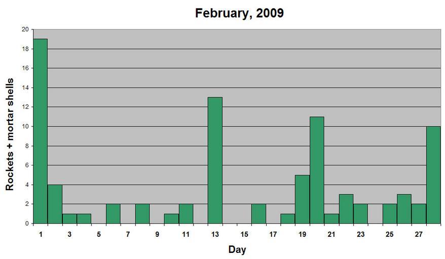 Keywords: Rockets and mortar February 2009.JPG en Statistic of rockets and mortar shells fired from Gaza into Israel along February 2009 Data from wikipedia page http //en wikipedia org/wiki/Timeline_of_the_2008 E2 80 932009_Israel E2 80 93Gaza_conflict Own Thevoyftp 2009-03-04 Check categories 2009 March 5 en wikipedia Gaza_Strip en wikipedia Qassam_rocket en wikipedia 2008 “2009_Israel “Gaza_conflict 8 Palestine Liberation Organization Hamas Rocket artillery Al-Aqsa Intifada Irregular military forces Islamism |