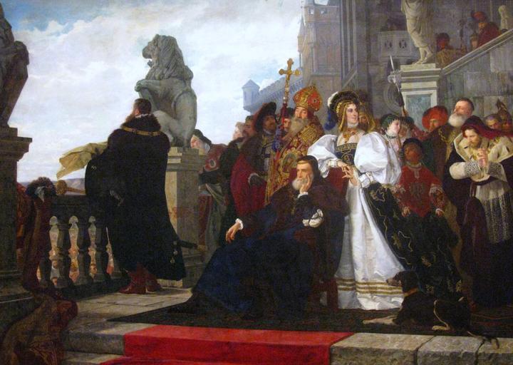 Keywords: Rodakowski Chicken War.png Artwork Creator Henryk Rodakowski LangSwitch 1537 in Poland King Sigismund the Old and his Court during the Noblemen's Rebellion Over the King triumphant Queen Bona by the railing General Jan Tarnowski speaks to the rebellious noblemen Rok 1537 król Zygmunt Stary i jego dwór na lwowskim zamku słuchają przemówienia hetmana Jana Tarnowskiego do zbuntowanej szlachty 1872 oil canvas cm 192 5 265 Institution National Museum Warsaw 1 accession number MP 432 object history credit line H Rodakowski 1872 signature/date Image taken by User Mathiasrex Maciej Szczepańczyk See below PD-old-100 DEFAULTSORT 1872; Chicken War Paintings by Henryk Rodakowski in the National Museum in Warsaw Sigismund I of Poland Bona Sforza Kokosza War |