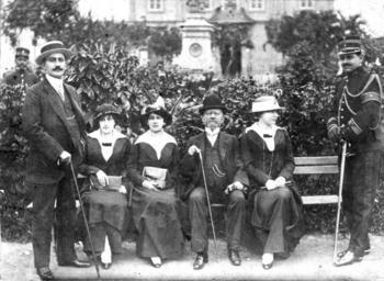 Keywords: Rodrigues Alves e família em Aparecida.jpg Conselheiro Rodrigues Alves presidente do Brasil de 1902 a 1906 e família na antiga igreja de Aparecida em 1913 <br/> Legenda Da esquerda para a direita Oscar Rodrigues Alves Isabel Rodrigues Alves Maria Rodrigues Alves Conselheiro Francisco de Paula Rodrigues Alves Zaïra Rodrigues Alves e capitão Eduardo Lejeune ajudante de ordens Acervo da família Rodrigues Alves 1913 author PD-BR-1937 Rodrigues Alves People of Aparecida Files by User Dantadd Families of Brazil Fashion in 1913 1913 in Brazil Military people in the 20th century Military people of Brazil Three-piece suits |