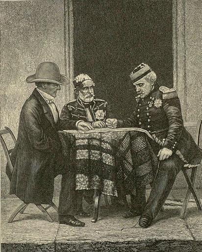 | Keywords: Roglan, Omer-Pasha & Pelisier.jpg en Lord Roglan Omar Pasha and Aimable Pélissier ru Ло д Роглан Оме -Паша и Пелисье под Севастополем в 1855 году В 1882 году Ив Ив К асовский бывший адьютант кн Д Го чакова ассказал исто ию этого по т ета В мае 1855 года после одного из отбитых шту омов вожди неп иятельской а мии п ислали па ламентё а к князю Д Го чакову п осить его по т ет Тот отвечал что у него в Севастополе нет фотог афа а д угой день неп иятель п ислал с па ламентё ом фотог афа и кн Го чаков дозволил снять с себя по т ет По т ет этот см File Gorchakov Mikhail Dmitrievich jpg был послан князем в пода ок своим п отивникам кото ые ода или его большой фотог афией - своим по т етом Оба эти по т ета х анились у И И К асовского кото ый пода ил их жу налу Русская ста ина Г авю у по фото исполнил Гео гий Иванович Г ачёв в 1882 году http //dlib rsl ru/rsl01003000000/rsl01003902000/rsl01003902325/rsl01003902325 pdf Русские деятели в по т етах изданных едакцией исто ического жу нала Русская ста ина Вто ое соб ание - Санкт-Пете бу г Типог афия Стасюлевича 1886 фото 1855 г авю а 1882 Г авю а Гео гия Ивановича Г ачёва PD-RusEmpire PD-old Military people of the Crimean War Omar Pasha Aimable Pélissier George Grachyov |