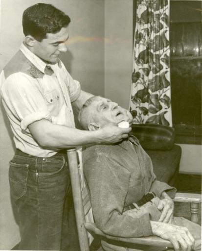 Keywords: shaving abe mast abemast roland richer rolandricher mennonite board of missions maple lawn homes home for the aged eureka illinois voluntary service mennonite voluntary service elderly nursing homes mennoniteboardofmissionsmaplelawnhomeshomefortheagedeurekaillinoisvoluntaryservicemennonitevoluntaryserviceelderlynursinghomes indoor monochrome Caption: Roland Richer (VSer) shaving Grandpa Abe Mast, 96 years old. Citation: Mennonite Board of Missions. Photographs. Illinois, Eureka, 1961-63. IV-10-7.2 Box 3 Folder 70. Mennonite Church USA Archives - Goshen. Goshen, Indiana. Caption: Roland Richer (VSer) shaving Grandpa Abe Mast, 96 years old. Citation: Mennonite Board of Missions. Photographs. Illinois, Eureka, 1961-63. IV-10-7.2 Box 3 Folder 70. Mennonite Church USA Archives - Goshen. Goshen, Indiana. |