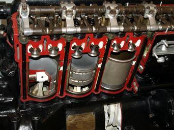 Keywords: Rolls-Royce Merlin Cylinders.JPG en Sectioned view of the Rolls-Royce Merlin aero engine cylinders and valve gear Taken at Royal Air Force Museum Cosford own Nimbus227 2009-09-16 Rolls-Royce Merlin engines in museums