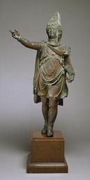 Keywords: Roman - Deity or Genius of the Eastern Provinces - Walters 541330.jpg Many religions were syncretistic meaning that as they grew and came into contact with other religions they adopted new beliefs and modified their practices to reflect their changing environment Both Greek and Roman religious beliefs were deeply influenced by the so-called mystery religions of the East including the Egyptian cult of Isis which revealed beliefs and practices to the initiated that remained unexplained or mysterious to the uninitiated Most popular Roman cults had associations with these mystery religions and included the prospect of an afterlife Although this figure was found in Egypt the elaborate costume and headdress are similar to images from southeastern Anatolia and Armenia Female figures in the same costume appeared as personifications of Asia and Armenia on monuments in Rome suggesting that the boy represents the genius or spirit of one of these eastern provinces century 1 BC - century 1 AD bronze cm 62 3 33 4 20 6 ; mount cm 16 4 18 9 21 4 accession number 54 1330 24690 Henry Walters Baltimore date and mode of acquisition unknown Walters Art Museum Henry Walters Acquired by Henry Walters The Gods Delight The Human Figure in Classical Bronze The Cleveland Museum of Art Cleveland 1988-1989 Fire of Hephaistos Large Classical Bronzes from North American Collections Harvard University Art Museums Cambridge; Toledo Museum of Art Toledo; Tampa Museum of Art Tampa 1996 Cleopatra und die Caesaren Bucerius Kunst Forum Hamburg 2006-2007 place of origin Latium in present-day Italy Walters Art Museum license Ancient Roman sculptures in the Walters Art Museum Art of Roman Egypt in the Walters Art Museum Genius Media contributed by the Walters Art Museum needs category review Semitics in Ancient Egypt |