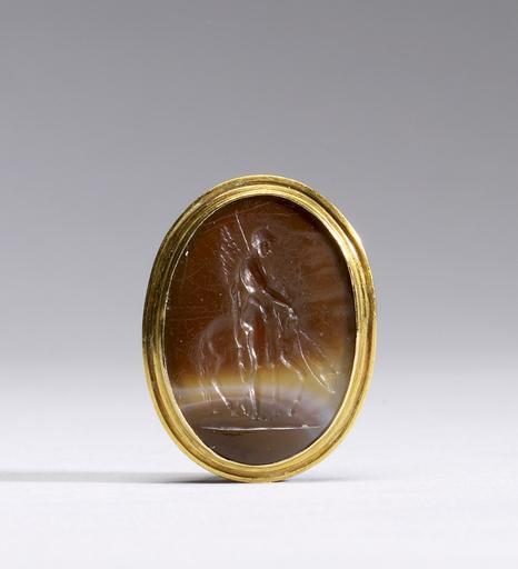 | Keywords: Roman - Gem with Intaglio with Bellerophon and Pegasos - Walters 421317.jpg Gem engraving was a major art form in ancient Greece and Rome Precious stones were thought to have healing and protective powers and were used as amulets and seals as well as jewelry Engraved or incised gems known as intaglios were often decorated with winged creatures such as the sphinx and the griffin The immortal winged horse Pegasos sprang from Medusa's neck when she was decapitated by the hero Perseus While Pegasos was drinking from a spring at Corinth the hero Bellerophon tamed him with a bridle given to him by the goddess Athena early Other date century 1 sardonyx gold Bezel cm 2 6 1 8 ; Mount cm 3 1 2 3 0 64 accession number 42 1317 38630 Joseph Brummer New York date and mode of acquisition unknown Walters Art Museum 1942 by purchase Museum purchase 1942 Things With Wings Mythological Figures in Ancient Greek Art The Walters Art Museum Baltimore 2005-2006 Things With Wings Mythological Figures in Ancient Greek Art Ward Museum Salisbury 2009 Heroes Mortals and Myths in Ancient Greece The Walters Art Museum Baltimore; Frist Center for the Visual Arts Nashville; San Diego Museum Of Art San Diego; Alexander S Onassis Public Benefit Foundation USA New York 2009-2011 place of origin Roman Empire Walters Art Museum license Ancient Roman art in the Walters Art Museum Jewellery in the Walters Art Museum Ancient Roman glyptics Bellerophon and Pegasus |