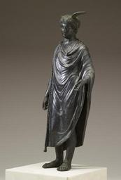 Keywords: Roman - Mercury - Walters 54605 - Three Quarter Left.jpg The wings one missing on the head of this figure identify it as representing Mercury the messenger of the gods It is exquisitely detailed and larger than most statuettes made for household worship suggesting that it was prominently displayed within the villa of a wealthy Roman family The hairstyle dates the piece to the mid 1st century when artists were still very much influenced by the Classical style of Greek art His left hand would have held the caduceus or herald's staff that is his attribute familiar today as a medical symbol AD 40-80 Julio-Claudian ; Flavian cast bronze with silver coat and inlay cm 29 2 11 8 5 6 accession number 54 605 25406 Henry Walters Baltimore date and mode of acquisition unknown Walters Art Museum Henry Walters Acquired by Henry Walters The Gods Delight The Human Figure in Classical Bronze The Cleveland Museum of Art Cleveland 1988-1989 place of origin Roman Empire Walters Art Museum license Ancient Roman sculptures in the Walters Art Museum Ancient Roman bronze statuettes of Mercurius Media contributed by the Walters Art Museum needs category review |